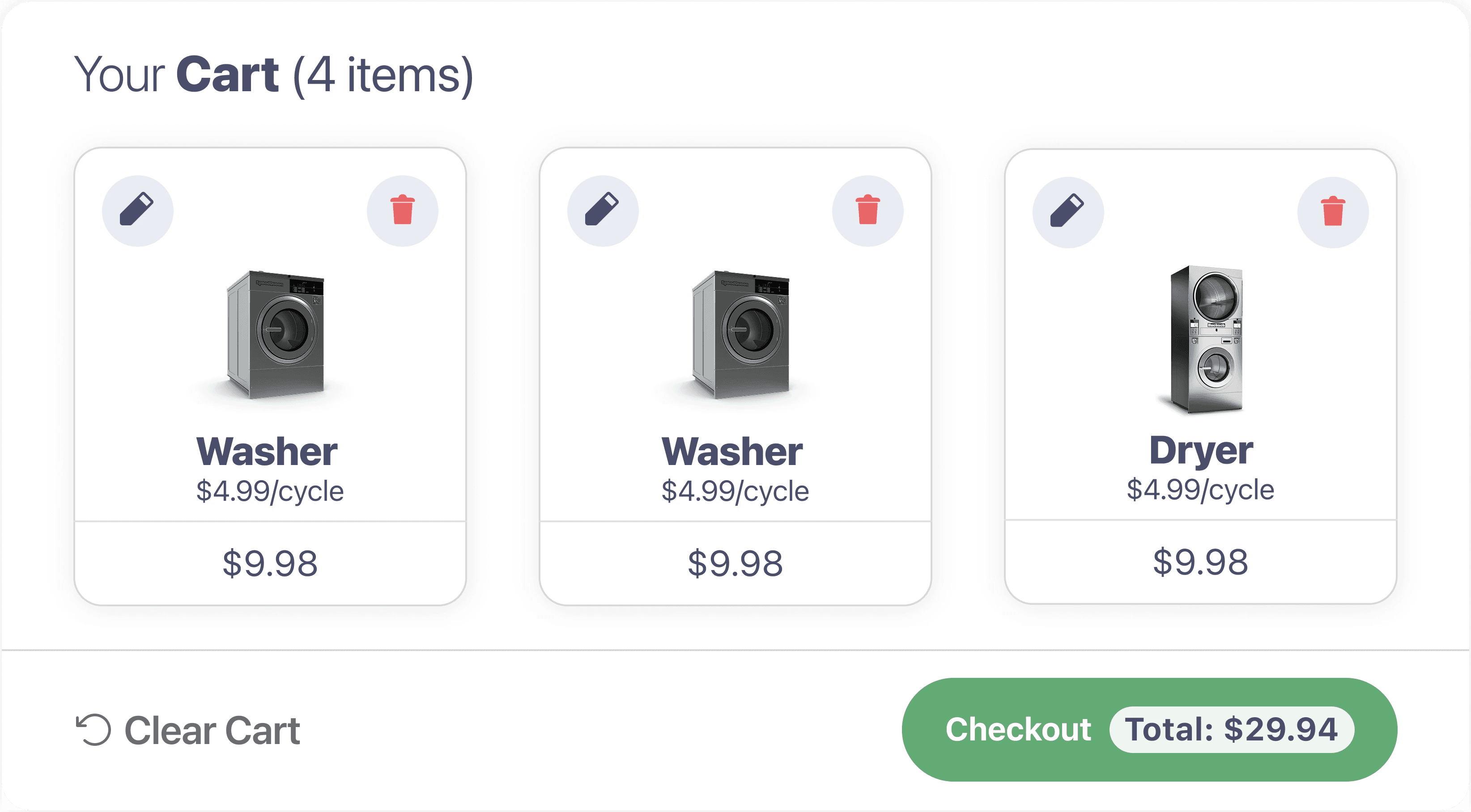 No surprises at checkout. Customers clearly see selected machines, pricing, discounts, and surcharges before they pay, reducing confusion and abandoned transactions.
